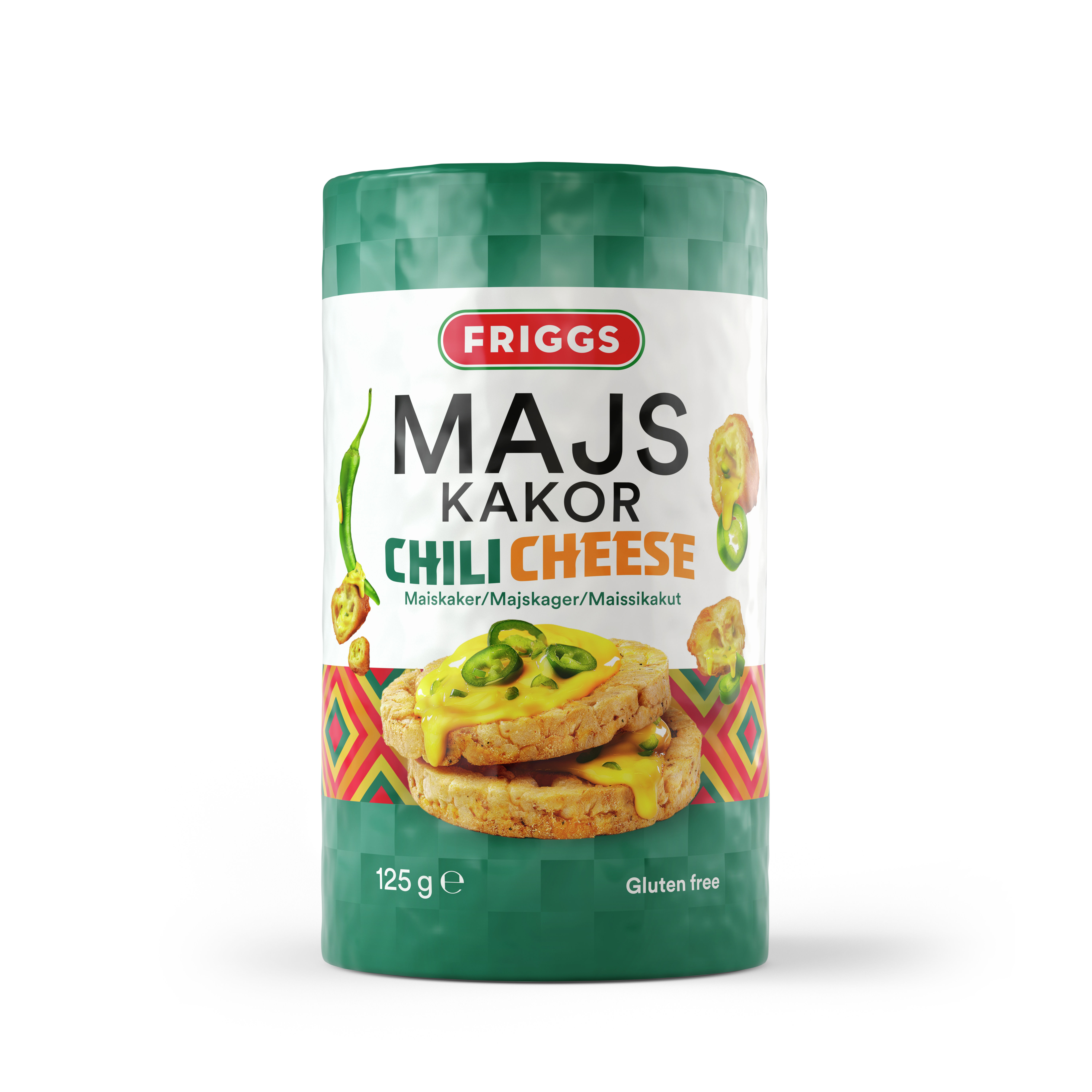 Majs (80%) (majsgryn, majsmjöl), rapsolja, kryddmix med smak av cheddar och jalapeno (7,9%) (maltodextrin (majs, potatis), vasslepulver (MJÖLK), salt, socker, OSTpulver (MJÖLK), lökpulver, kryddor (persilja, jalapeno, vitlök, koriander, oregano, spansk peppar, vitpeppar), naturlig MJÖLKarom, konserveringsmedel (mjölksyra), tomatpulver, kryddextrakt (paprika), naturlig koriander arom). Kan innehålla spår av soja och sesamfrö.