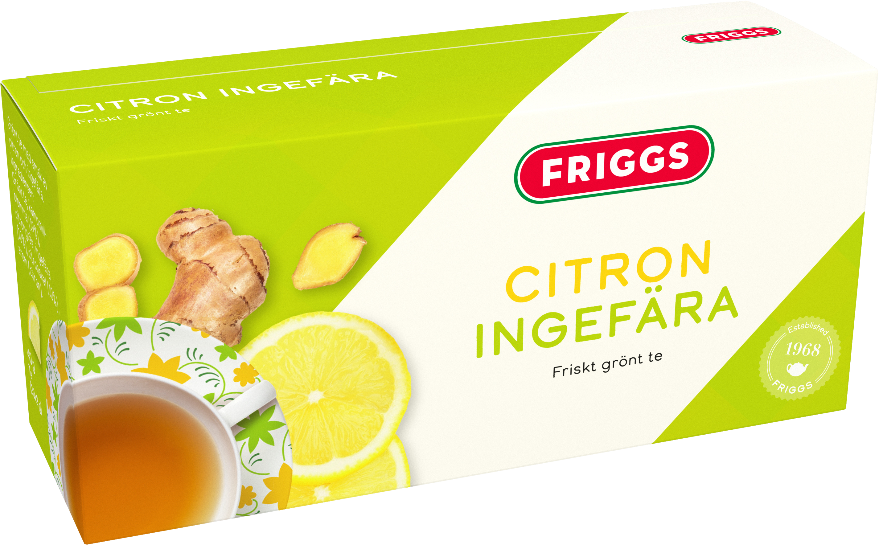 Friggs Ingefära Citron är ett grönt te med frisk smak av citron och ingefära. Grönt te innehåller naturligt koffein och kan vara uppiggande.