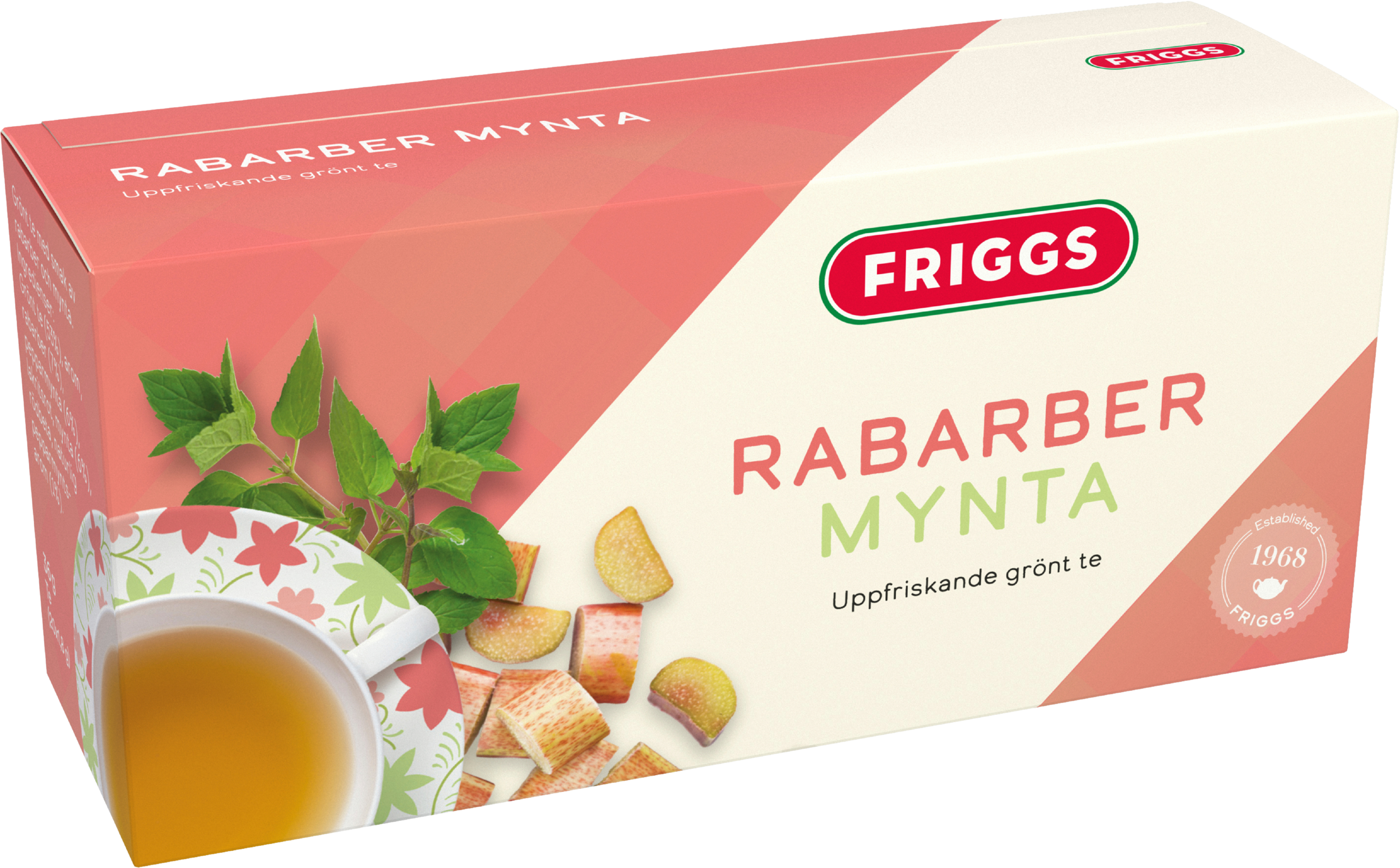 Friggs Rabarber Mynta Te är ett gott grönt te med en god kombination av rabarber och mynta som påminner om sensommaren. Innehåller koffein och passar att dricka på morgonen eller förmiddagen.